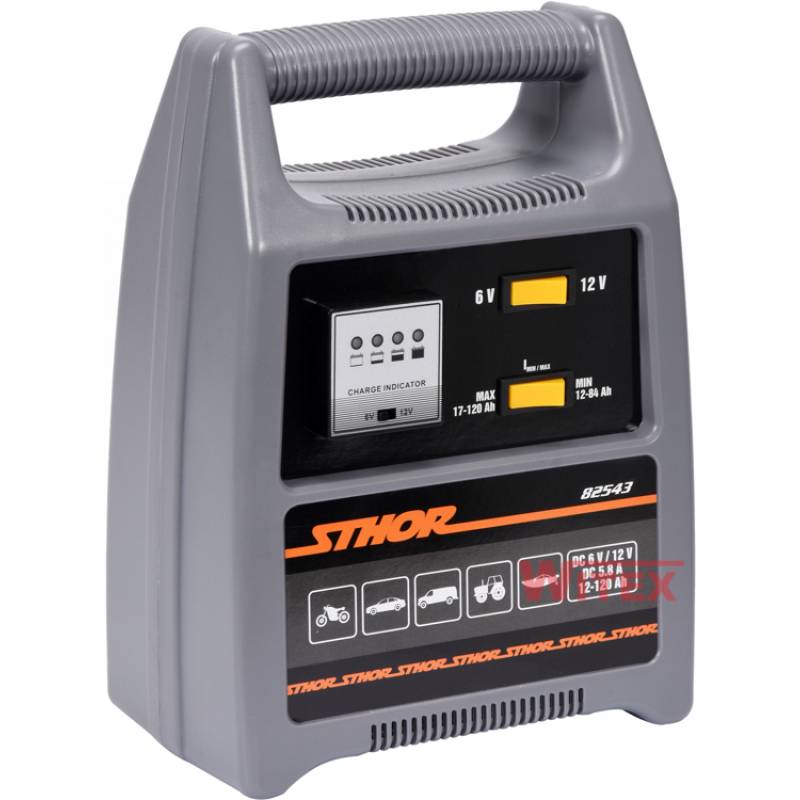 Prostownik marki STHOR posiada transformator toroidalny, zabezpieczenie bezpiecznikiem przed przeładowaniem i przepięciem, włącznik prądowy, ledowy wskaźnik poziomu naładowania. Umożliwia dobranie optymalnego prądu ładowania. Urządzenie przeznaczone do ładowanie akumulatorów 6/12 V w samochodach osobowych, do akumulatorów WET (mokrych, kwasowo-ołowiowych.)